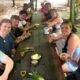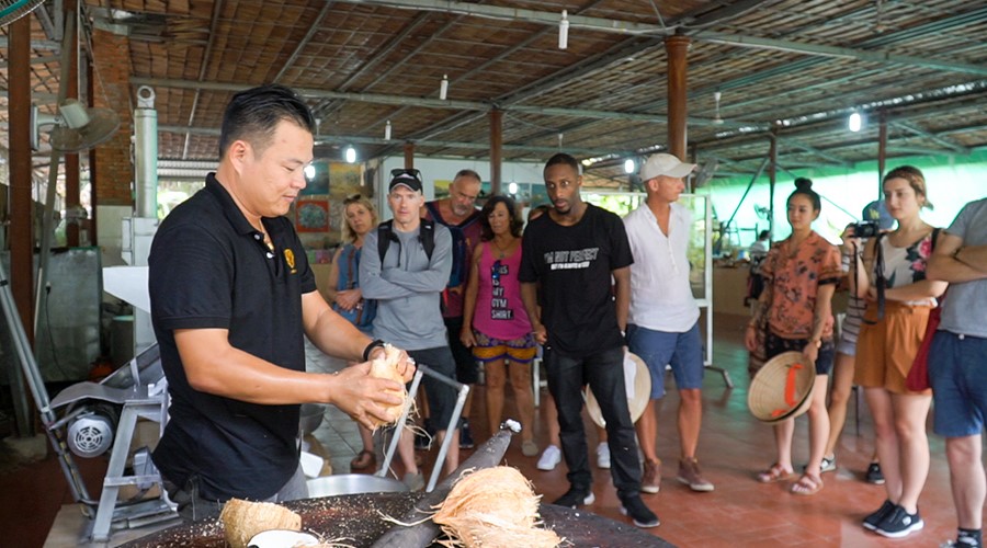 The boat takes you to a small canal, escaping the hustle and bustle of the town. We disembark at a coconut island in Ben Tre and enjoy a walk around the village. Stop at a local family home to enjoy tropical fruit, taste the honey tea and honey wine and listen to Vietnamese traditional music performed by the villagers. Check out the coconut candy shop and learn how to make candy, and see handicrafts made from the coconuts.
